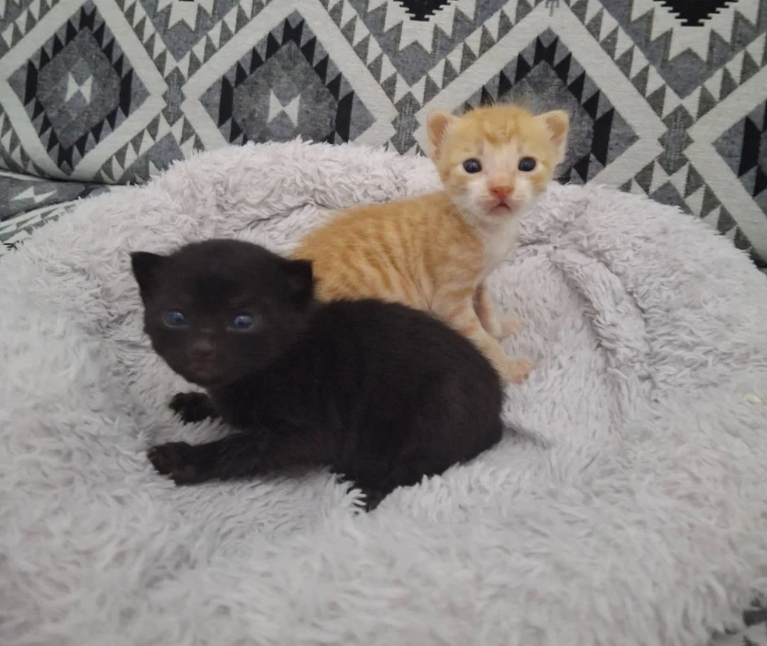 That’s how Konan arrived at our shelter, and of course, we placed him on the same bottle feeding schedule as Eclair. When we introduced this pair of kittens, both exactly the same age, something clicked. Since then, they’ve eaten together, played together, napped together, and raised adorable chaos together, as kittens do.